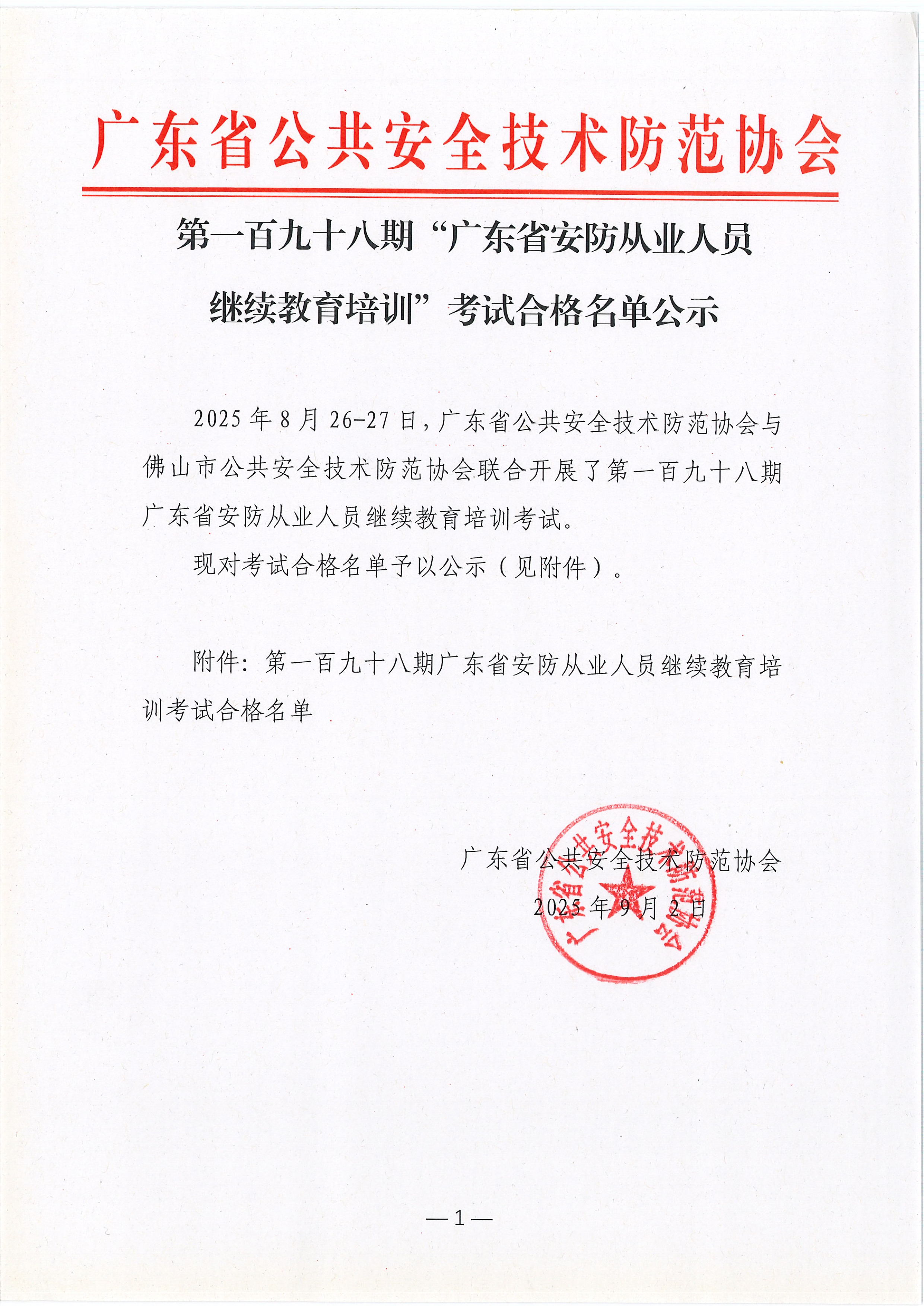 第一百九十八期“廣東省安防從業人員繼續教育培訓”考試合格名單公示